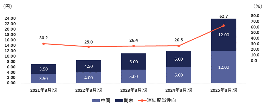 以上のことから、新中期経営計画では初年度である2025年3月期に現行1株あたり配当金12円を倍である24円とし、2026年3月期に配当性向を60%以上まで引き上げ、最終年度までに上限30億円とする自己株式の取得を含む総還元性向70%以上とする方針を掲げ、投資家の皆様から魅力ある投資対象とするため、収益はもとより株主還元策を拡大いたします。