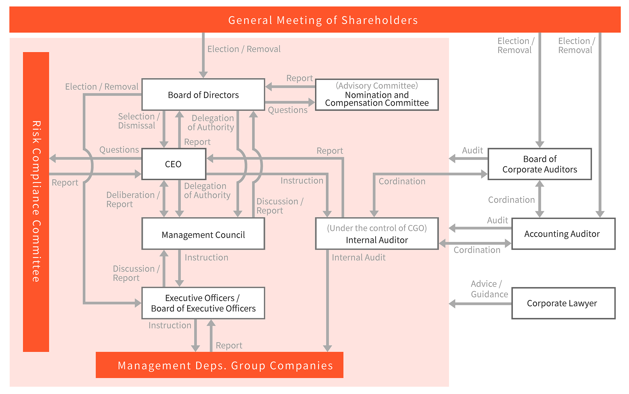 Prestige International functions as a holding company with two main group companies: Prestige Core Solution Inc., which oversees domestic BPO business activities, and Prestige Global Solution Inc., which oversees international BPO business activities. Prestige International appointed the directors of major group companies as executive officers of the Company to enable flexible business execution in response to changes in the business environment surrounding the Company and main group companies, as well as to promote the identification and nurturing of candidates to succeed senior managers. The Board of Executive Officers has been established for the purpose of achieving integrated management.