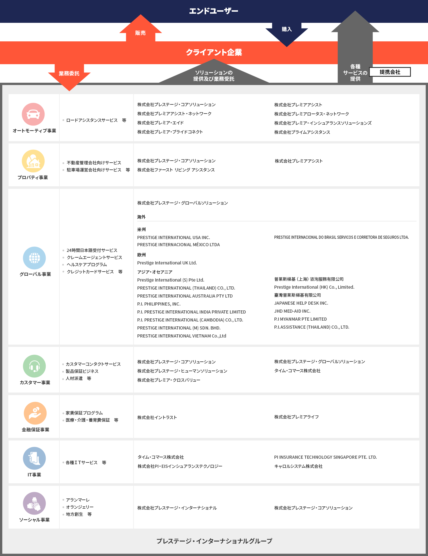 損害保険会社、自動車会社(メーカー、販売会社)等を主なクライアント企業とし、エンドユーザー(被保険自動車の保有者、自動車購入者)に対して24時間365日体制での電話・駆けつけ対応を行うロードアシストサービスに加え、ディーラーサポートや自動車延長保証等の幅広いサービス提供を行っています。現場駆けつけでは、技術面及び接客面において品質の高い当社グループ独自のサービス提供を可能にしています。