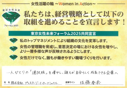 株式会社プレステージ・インターナショナル(本社:東京都千代田区、代表取締役:玉上 進一、以下「当社」)は、東京都が行う女性活躍・ダイバーシティ経営の推進に向けた「東京女性未来フォーラム共同宣言」に賛同しましたことをお知らせします。