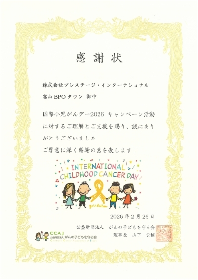 株式会社プレステージ・インターナショナル(本社:東京都千代田区、代表取締役:玉上 進一)は、「国際小児がんデー」に小児がん支援のためのチャリティー募金活動を実施し、本活動を通じて、公益財団法人がんの子どもを守る会より各拠点宛てに感謝状を受領しましたことをお知らせいたします。